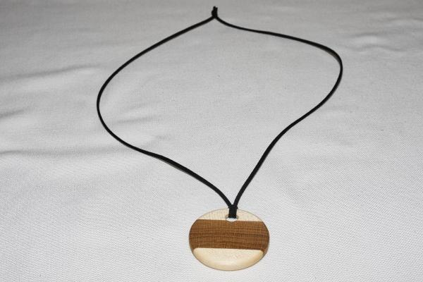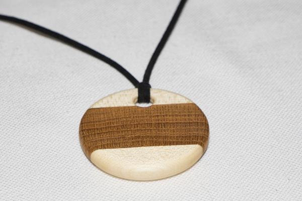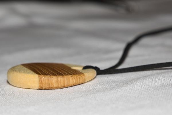 Dieser runde Schmuckanhänger ist aus Ahornholz und Eichenholz gefertigt und lässt sich nahezu zu jedem Kleidungsstück tragen. Die Oberfläche ist fein geschliffen und mit einem Bio-Holzschutzöl versiegelt sodass er sehr schön als Blickfang auf dern Dekolltè ins Auge fällt. Das ist das optimale Geschenk für seine Liebste.